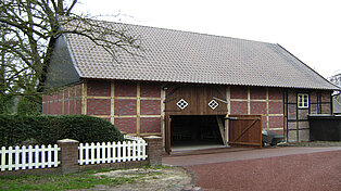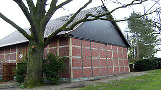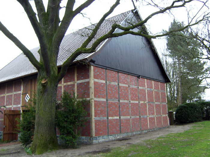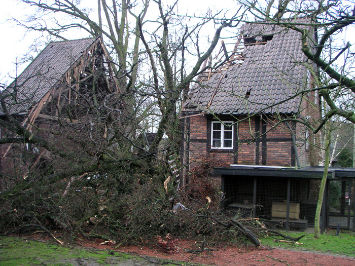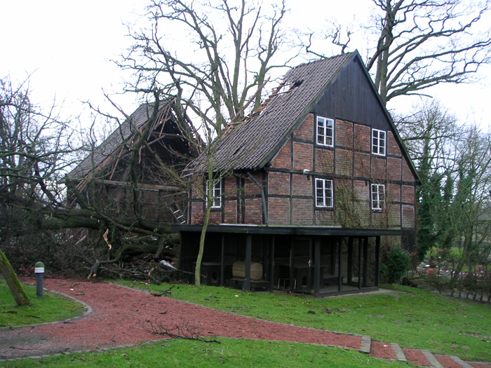 Bei den starken Orkanböen im Münsterland im Januar 2007 wurde dieses Fachwerkhaus durch einen umstürzenden Baum regelrecht zerteilt. Neben einem nicht unerheblichen Sachschaden am Inventar war auch das Fachwerkhaus so zerstört, daß nur ein kleiner Bereich übrig blieb.