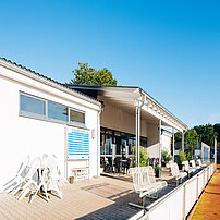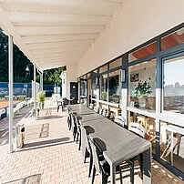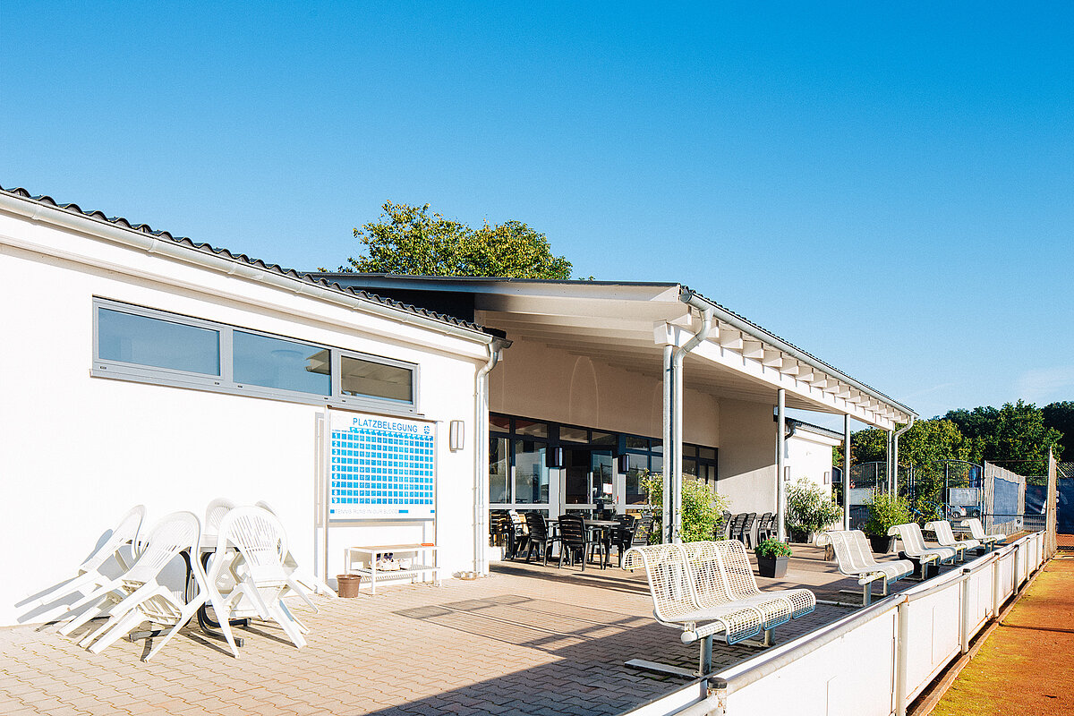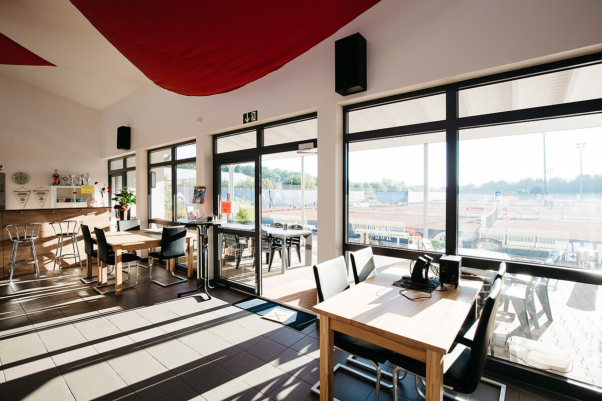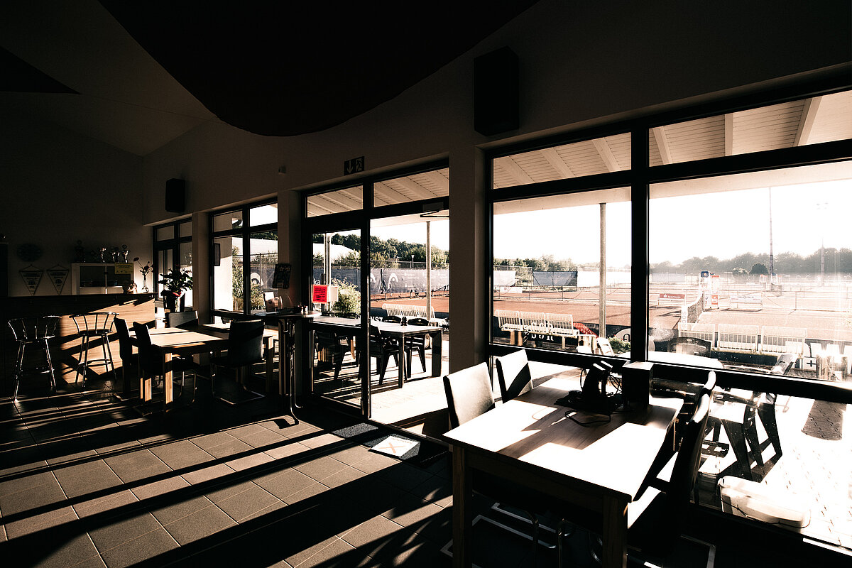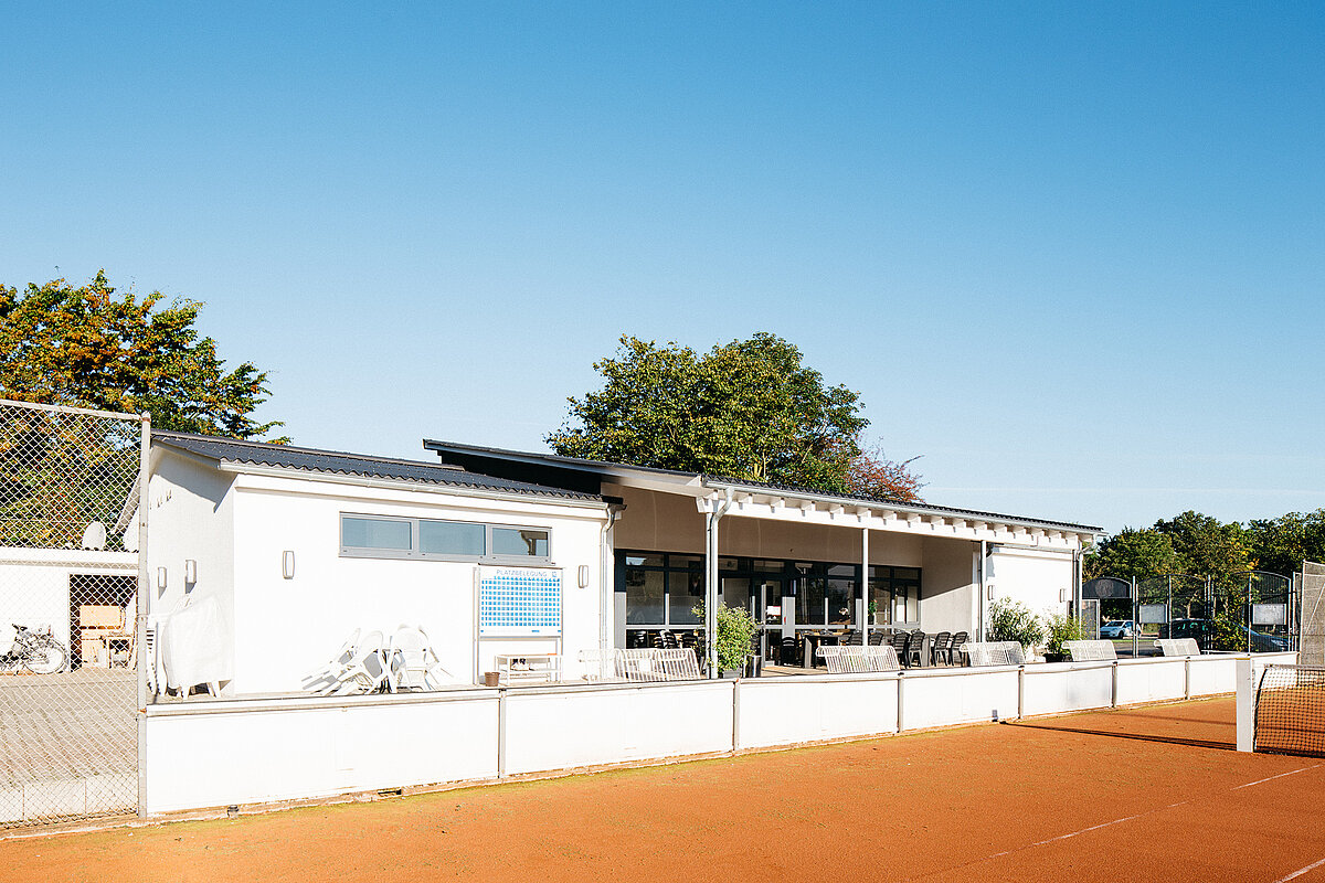 Das in die Jahre gekommene und zu klein gewordene Tennisheim "Blau-Weiss e.V." in Oelde wurde durch einen zeitgemäßen Neubau in Holzrahmenbauweise ersetzt. Ein großzügiger Vereinsraum bildet das Zentrum des Gebäudes, dies zeigt sich auch nach außen durch das abgesetzte Pultdach, welches fließend in den Außenraum übergeht und die Terrasse schützt. Farbige Stoffsegel modulieren hier das durch die Oberlichter hereinfallende Licht und schaffen eine behagliche Raumatmosphäre, ansonsten prägen neutrale Farben und natürliche Holztöne die Raumgestaltung. Das Glasband gegenüber kann im Sommer geöffnet werden und schafft so eine Verbindung zwischen innen und außen.