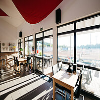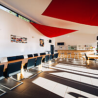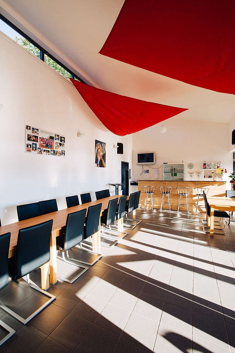 Weitere Funktionsbereiche wie Umkleiden, Duschen, Lagerräume, Küche und ein großer WC-Bereich schließen sich an den Hauptraum an und sind unauffällig integriert worden, so dass sich die ganze Dimension des Komplexes nicht gleich erschließt.