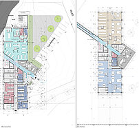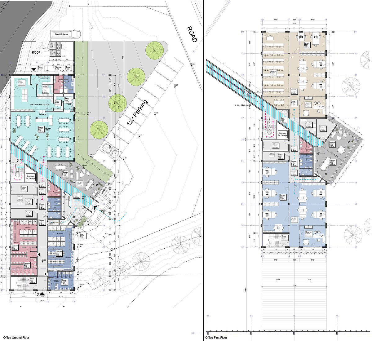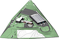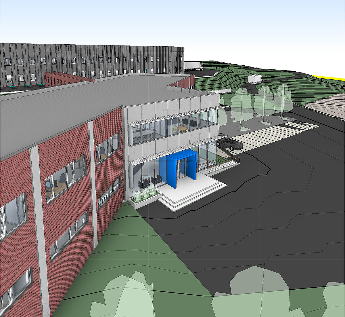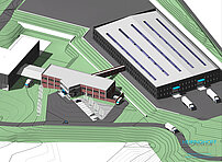Der Baukörper des Bürogebäudes fungiert als Verbindungsbau zwischen verschiedenen Geländeniveaus und Funktionsbereichen und schafft eine nahtlose Integration in die natürliche Umgebung.