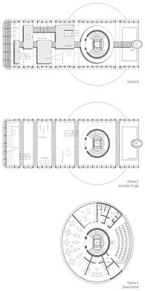 Man gelangt per Aufzug auf die mittlere Ebene, welche Café, Shop und Vortragsraum beherbergt. Boden und Decke übernehmen die Funktion eines Zahnrades, in welches die rotierenden Ausstellungsflügel greifen, rückwärtig von einem Motor angetrieben. Der obere pendelt im zweistündigen Rhythmus in einem Winkel von 270° umher. Einem Fernrohr gleich, peilt er Standorte aus Vergangenheit, Gegenwart und Zukunft an, die das Interesse wecken sollen: z. B. die Grenze Garzweiler I / II, Kohlebunker und umliegende Orte, die vom Tagebau verdrängt werden. Wird ein solcher Punkt avisiert, so „fokussiert“ der Flügel: die umlaufenden Fensterbänder verdunkeln sich, wodurch die Nutzung der Ausstellung unterbrochen und die Aufmerksamkeit auf die zentrale vordere Öffnung gelenkt wird. Der untere dreht mit einer konstanten Geschwindigkeit von 2° pro Jahr und folgt dem fortschreitenden Tagebau. Er markiert so den aktuellen Stand des Abbaus, indem er die Position des vorderen Baggers anpeilt. Innen befindet sich eine Ausstellung über das Areal im Wandel der Zeit, politische Entscheidungen und Umsiedlungen. Projektionswände, auf die ein zeitversetztes Bild des entsprechenden Ausblicks geworfen wird, bezeugen die landschaftliche Veränderung.