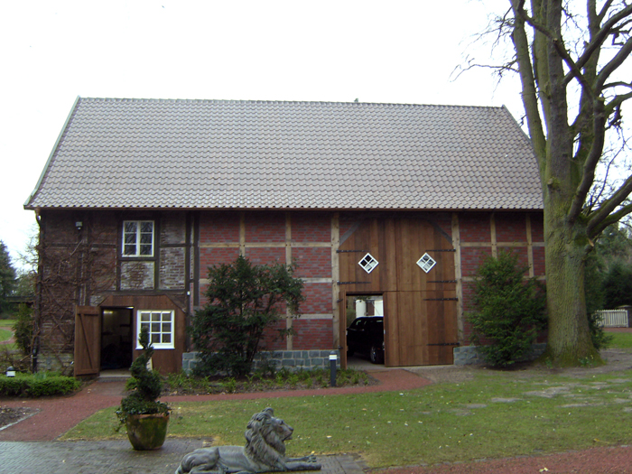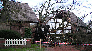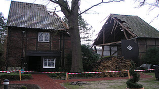 Bei den starken Orkanböen im Münsterland im Januar 2007 wurde dieses Fachwerkhaus durch einen umstürzenden Baum regelrecht zerteilt. Neben einem nicht unerheblichen Sachschaden am Inventar war auch das Fachwerkhaus so zerstört, daß nur ein kleiner Bereich übrig blieb.