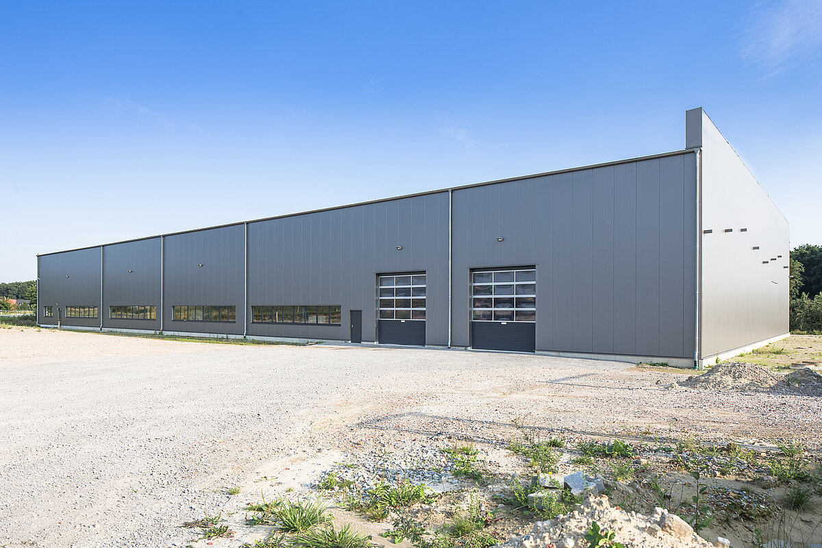Im Gewerbegebiet „A2 Oelde“ entstand ein Firmenneubau eines holzverarbeitenden Betriebes. Hierfür war die Aufstellung von sehr großen Maschinen (43 Meter) notwendig, die für eine optimale Funktion möglichst stützenfrei aufgestellt werden mussten. Besonderes Augenmerk galt auch der Optimierung der Geländemodellierung, da ca. vier Meter Höhenversatz kompensiert und optimal genutzt werden sollten. Dies wurde durch eine detaillierte 3D-Planung der Gelände-/Entwässerungsflächen möglich. Das Bürogebäude in MHM-Bauweise wird ab Ende 2015 errichtet.
