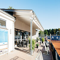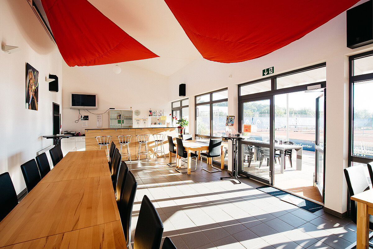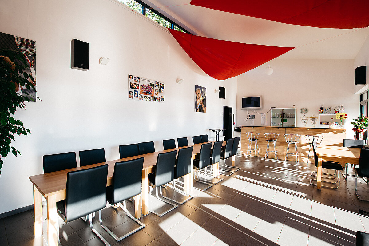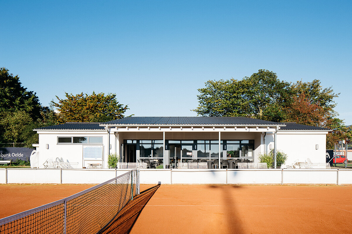 Das in die Jahre gekommene und zu klein gewordene Tennisheim "Blau-Weiss e.V." in Oelde wurde durch einen zeitgemäßen Neubau in Holzrahmenbauweise ersetzt. Ein großzügiger Vereinsraum bildet das Zentrum des Gebäudes, dies zeigt sich auch nach außen durch das abgesetzte Pultdach, welches fließend in den Außenraum übergeht und die Terrasse schützt. Farbige Stoffsegel modulieren hier das durch die Oberlichter hereinfallende Licht und schaffen eine behagliche Raumatmosphäre, ansonsten prägen neutrale Farben und natürliche Holztöne die Raumgestaltung. Das Glasband gegenüber kann im Sommer geöffnet werden und schafft so eine Verbindung zwischen innen und außen.