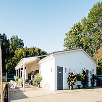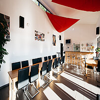 Weitere Funktionsbereiche wie Umkleiden, Duschen, Lagerräume, Küche und ein großer WC-Bereich schließen sich an den Hauptraum an und sind unauffällig integriert worden, so dass sich die ganze Dimension des Komplexes nicht gleich erschließt.