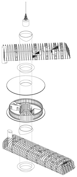 Man gelangt per Aufzug auf die mittlere Ebene, welche Café, Shop und Vortragsraum beherbergt. Boden und Decke übernehmen die Funktion eines Zahnrades, in welches die rotierenden Ausstellungsflügel greifen, rückwärtig von einem Motor angetrieben. Der obere pendelt im zweistündigen Rhythmus in einem Winkel von 270° umher. Einem Fernrohr gleich, peilt er Standorte aus Vergangenheit, Gegenwart und Zukunft an, die das Interesse wecken sollen: z. B. die Grenze Garzweiler I / II, Kohlebunker und umliegende Orte, die vom Tagebau verdrängt werden. Wird ein solcher Punkt avisiert, so „fokussiert“ der Flügel: die umlaufenden Fensterbänder verdunkeln sich, wodurch die Nutzung der Ausstellung unterbrochen und die Aufmerksamkeit auf die zentrale vordere Öffnung gelenkt wird. Der untere dreht mit einer konstanten Geschwindigkeit von 2° pro Jahr und folgt dem fortschreitenden Tagebau. Er markiert so den aktuellen Stand des Abbaus, indem er die Position des vorderen Baggers anpeilt. Innen befindet sich eine Ausstellung über das Areal im Wandel der Zeit, politische Entscheidungen und Umsiedlungen. Projektionswände, auf die ein zeitversetztes Bild des entsprechenden Ausblicks geworfen wird, bezeugen die landschaftliche Veränderung.