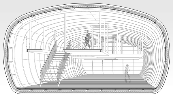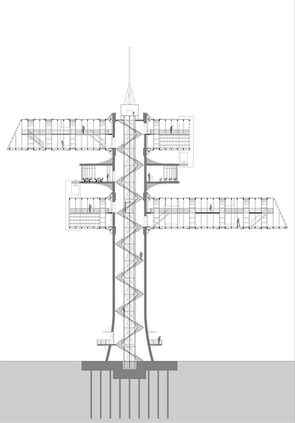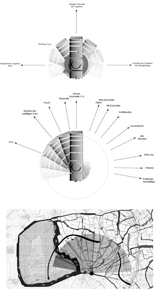 Grundidee bei der Formfindung war die Reaktion des Gebäudes auf die kontinuierlichen räumlichen Veränderungen des Tagebaus Garzweiler, welche sowohl für den Herannahenden als auch für den Besucher im Gebäude erfahrbar gemacht werden sollen: die großmaßstäbliche Umschichtung von Erdreich, der Fortschritt der gigantischen Schaufelradbagger und der Wandel der zerstörten Landschaft in rekultivierte Naturräume. Nach außen zeigt sich diese durch die Rotation der beiden Ausstellungsflügel, welche in verschiedenen Geschwindigkeiten um den Kern rotieren, während der Besucher im Innenraum einen Wandel von Raumqualitäten, Nutzungsmöglichkeiten und Ausblicken erlebt.